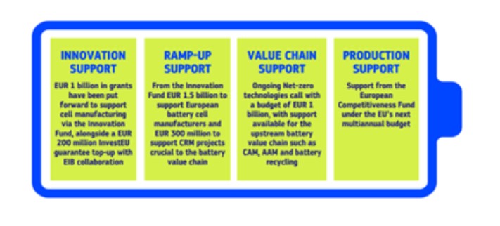 | New funds under the Battery Booster | €1.5 billion from the Innovation Fund in the form of interest-free loans. This funding aims to support manufacturing ramp-up ahead of the next EU budget period, which is expected to introduce the ECF.